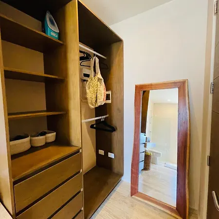 The 33 m² apartment lies in the Zama district, nearly a 10-minute ride from the Tulum Archaeological Site. The city centre can also be reached within a 15-minute walk from the apartment.